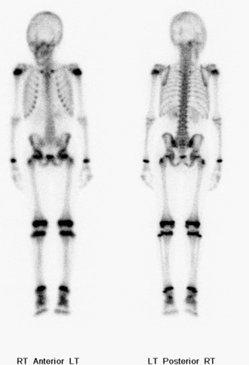 Normal pediatric whole body Technetium 99m-methylene diphosphonate (Tc-99m MDP) bone scan displays intense expected radiotracer uptake in the physes of long bones. |