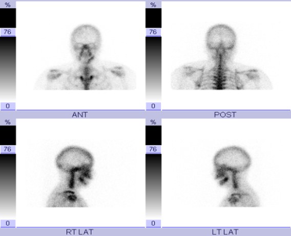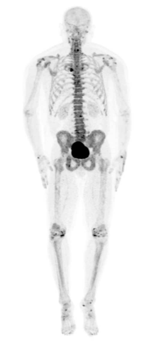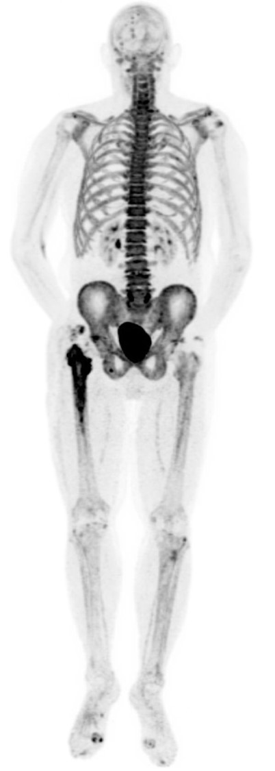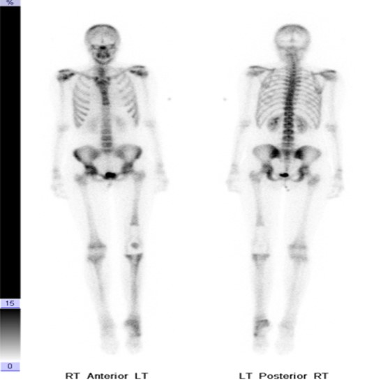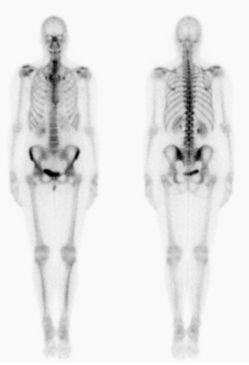 Normal whole body pediatric and adult bone scintigraphy with technetium 99m methylene diphosphonate (MDP) display different features (figure 1). In the pediatric population there is intense radiotracer uptake in the growing physes of long bones. Normal adult whole body planar bone scans with Tc-99m MDP demonstrates normal expected uptake in the bilateral sacroiliac joints, iliac crest, acromioclavicular joints, sternoclavicular joints, and nasal region. Normal radiotracer activity is excreted into the kidneys and urinary bladder.