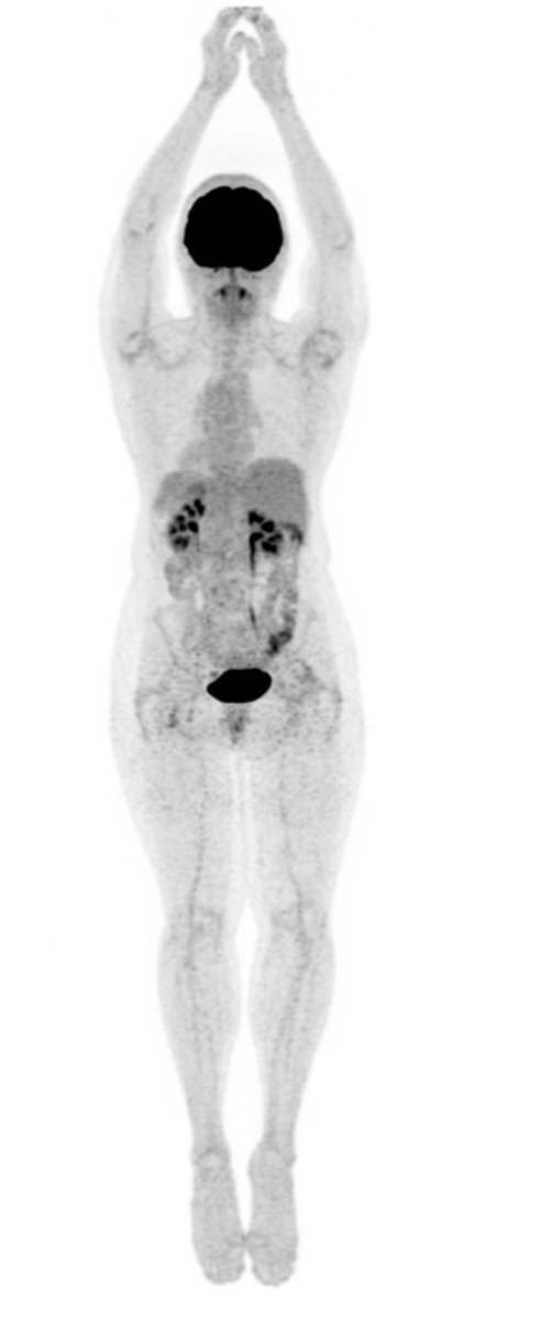 A) Whole-body F18-FDG PET scan maximum intensity projection (MIP) bone demonstrates intense uptake in the brain and renal excretion. Mild activity is seen within the bone marrow. B) Whole-body F18-NaF PET bone scan maximum intensity projection (MIP) demonstrates scattered focal uptake within the spine, bilateral knees, feet and shoulder joints consistent with degenerative bone remodeling. Note: Intense uptake is seen within the brain on FDG PET and no uptake is seen on NaF PET. |