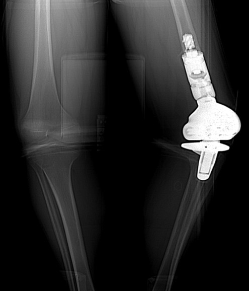 15 year-old girl with history of osteosarcoma of left femur status post resection and prosthesis. Lateral (A) and AP (B) radiographs of the left knee show a distal femur limb sparing prosthesis and knee arthroplasty. |
