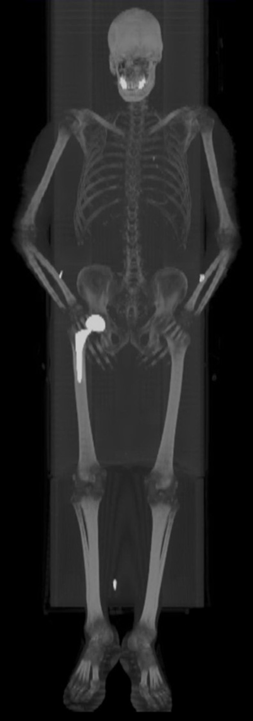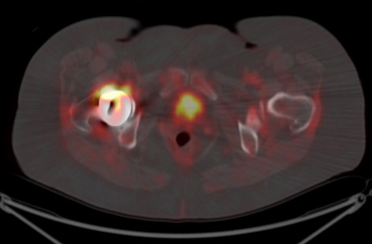 49 year-old women with right hip hemiarthroplasty. Maximum intensity projection images of CT with bone window (A), NaF PET (B), and fused PET-CT image (C) demonstrate right femoral prosthesis with intense NaF uptake in the proximal femur surrounding the prosthesis, representing reparative bone remodeling. This can last for years and is not pathological. |