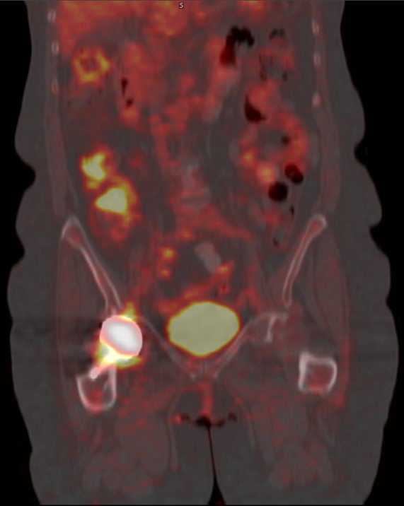 Axial bone window (5B) NON-attenuation corrected (NAC) and attenuation corrected (AC) FDG PET (5C), fused axial and coronal (5D, 5E), images of the pelvis demonstrate the right femoral prosthesis with photopenia in the region of prosthesis. Periprosthetic FDG uptake is seen on AC and fused images and is minimally seen on the NAC image, consistent with attenuation correction artifact. |