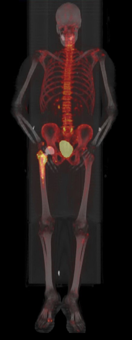 While FDG is an analog of glucose, the fluoride in NaF incorporates into the hydroxyapatite (mineral component) of bone by replacing a hydroxyl group to form fluoroapatite. F18-NaF PET bone scan commonly demonstrate non-malignant, scattered focal uptake within the spine, bilateral knees, feet and shoulder joints, consistent with degenerative bone remodeling. Normally, there is no brain uptake on NaF PET scanning.