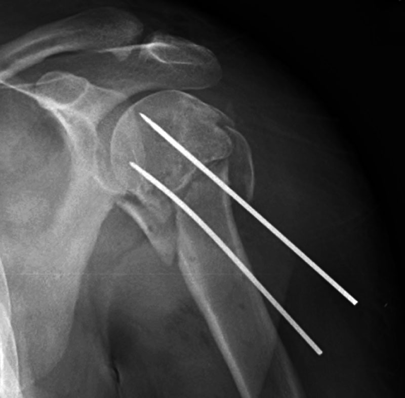 Casts and splints can be used either for temporary immobilization of an extremity, or they can be used for definitive treatment of an extremity fracture. They are often combined with internal fixation to provide additional support and protection of the extremity. Braces are also used to limit the range of motion of a joint after surgery or after trauma. In many cases, percutaneous pins ("Kirschner or K-wires") (figure: K-wires) are used in combination with a plaster cast to achieve treatment similar to an external fixator, so-called "pins in plaster" (figure: pins in plaster).