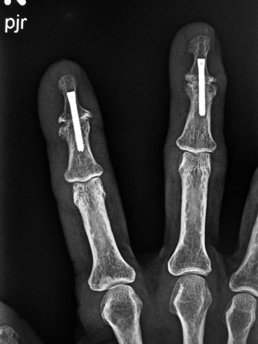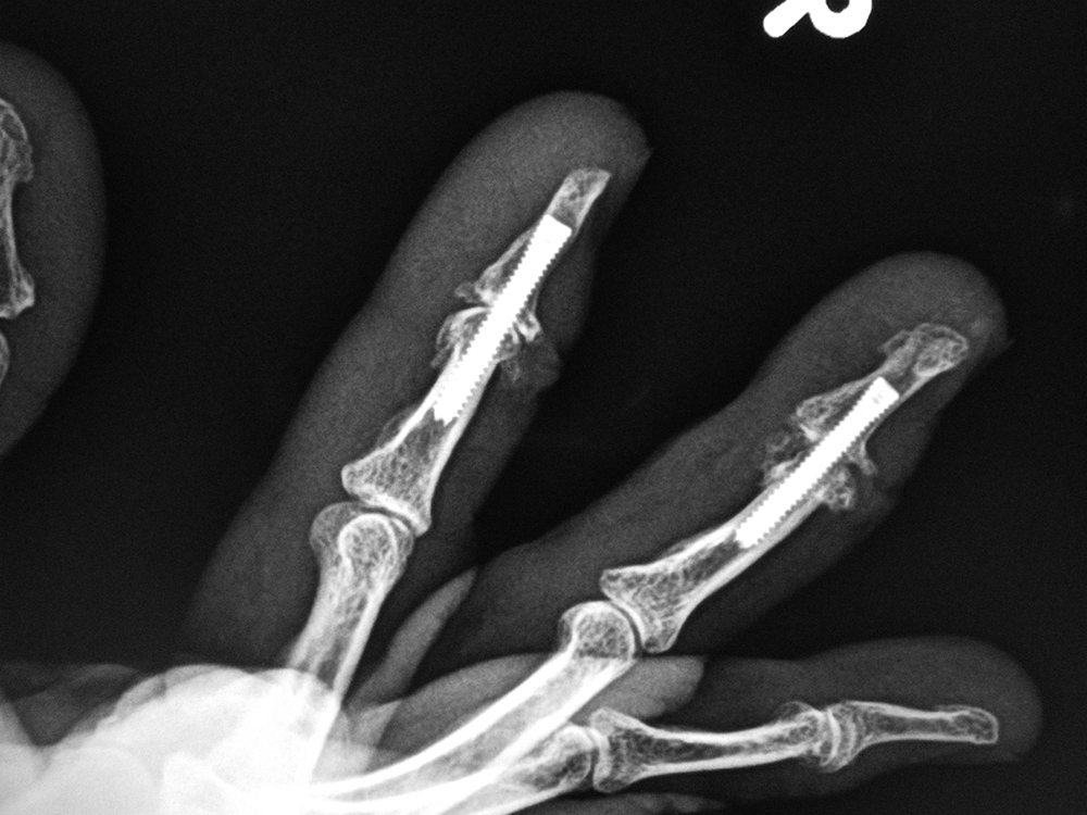 | The Accutrak screws are used for arthrodesis of the distal interphalangeal joints of the right index and long fingers in a woman with severe osteoarthritis.