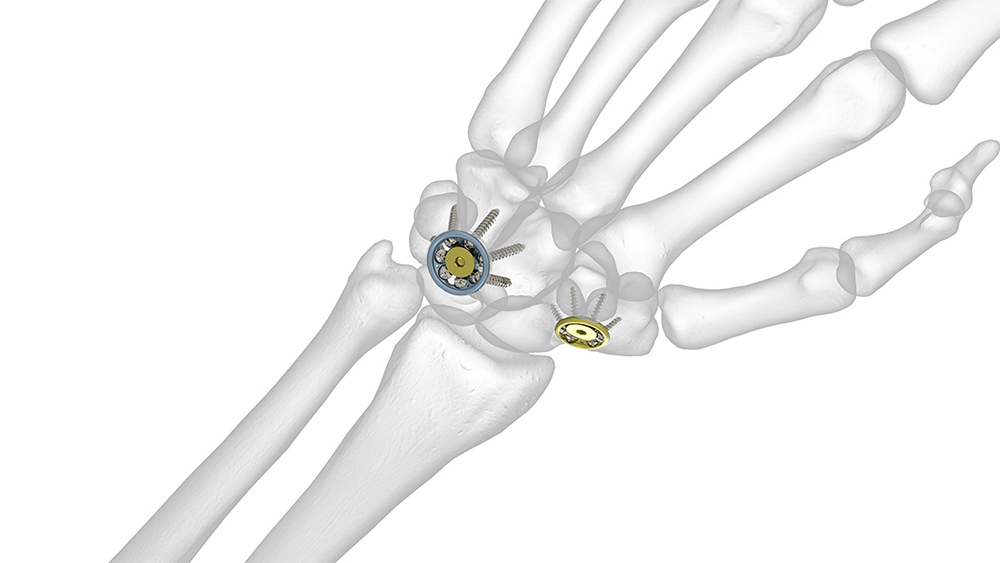 Total or partial wrist fusion is sometimes performed for severe carpal osteoarthritis. In this regard, a spider plate may be used for partial carpal arthrodesis (figure: spider plate). Modular plate systems are available for four-corner and other limited wrist fusions for osteoarthritis, complex fractures, revision of failed previous wrist fusions, marked carpal instability, or rheumatoid arthritis (figure: Acumed hub cap fusion plates).