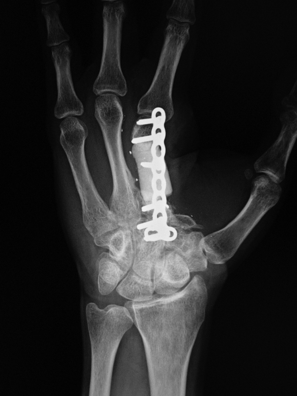 benign or malignant bone lesions, fracture nonunion, and osteomyelitis (figure: enchondroma treatment; figure: buttress plate with bone substitute; figure: metastatic renal cell carcinoma treatment).